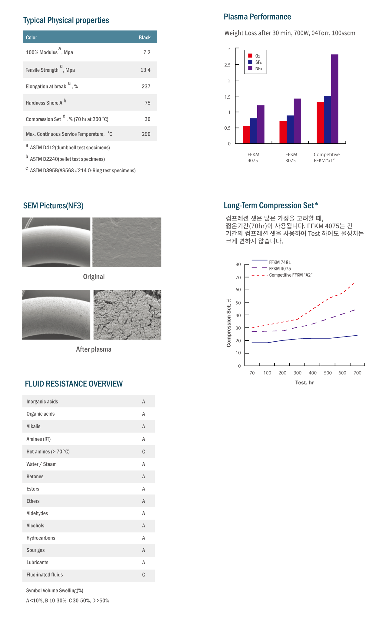 FFKM 4075 제품은 극심한 프라즈마, 높은 에너지, 고온이 수반되는 반도체의 건식 에칭, 에싱 및 PVD, CVD(Chemical Vapor Deposition) 공정에 적합하게 설계된 제품입니다. 이 제품은 산소와 불소 프라즈마 환경에서 오염 정도의 감소, 중량 손실의 최소화 및 탈기체의 최소화의 특성을 보입니다. 각종 화학물질에 뛰어난 저항성과 낮은 컴프레션 셋 등의 물리적 특성과 기계적 성질이 우수하여 진공 상태에서 장기간에 걸친 씰 신뢰성을 유지하며, 정적 및 동적에 모두 잘 적용됩니다.